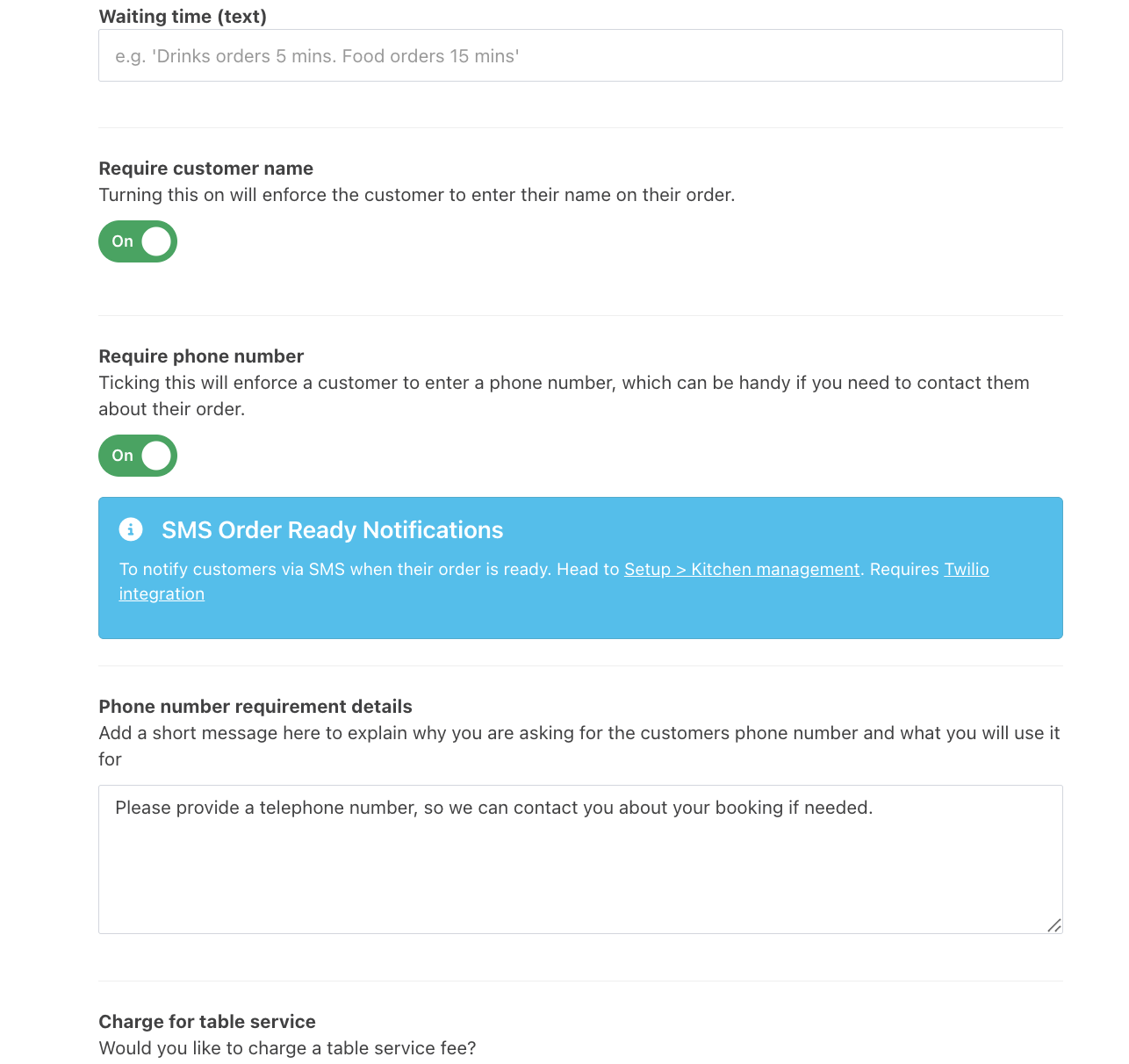 Require phone number - By turning this on you can capture the customer's phone number as part of the ordering process. You will also need to enable this if you want to send automated SMS notifications when an order is ready for collection.