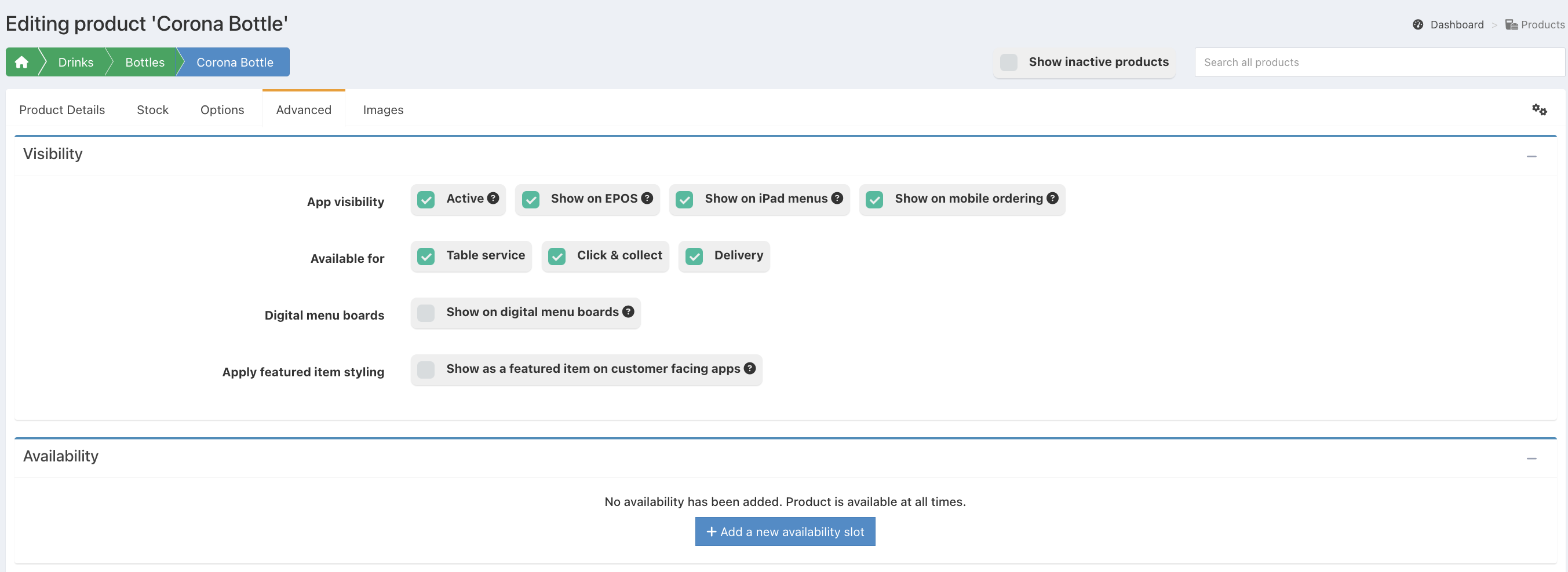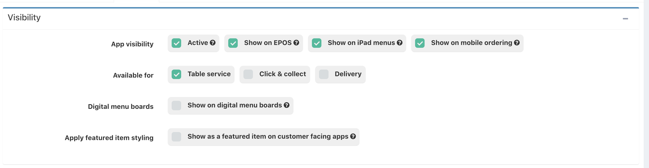 - For mobile ordering you can also select which service methods the product is available for - Table service, click & collect, and/or delivery