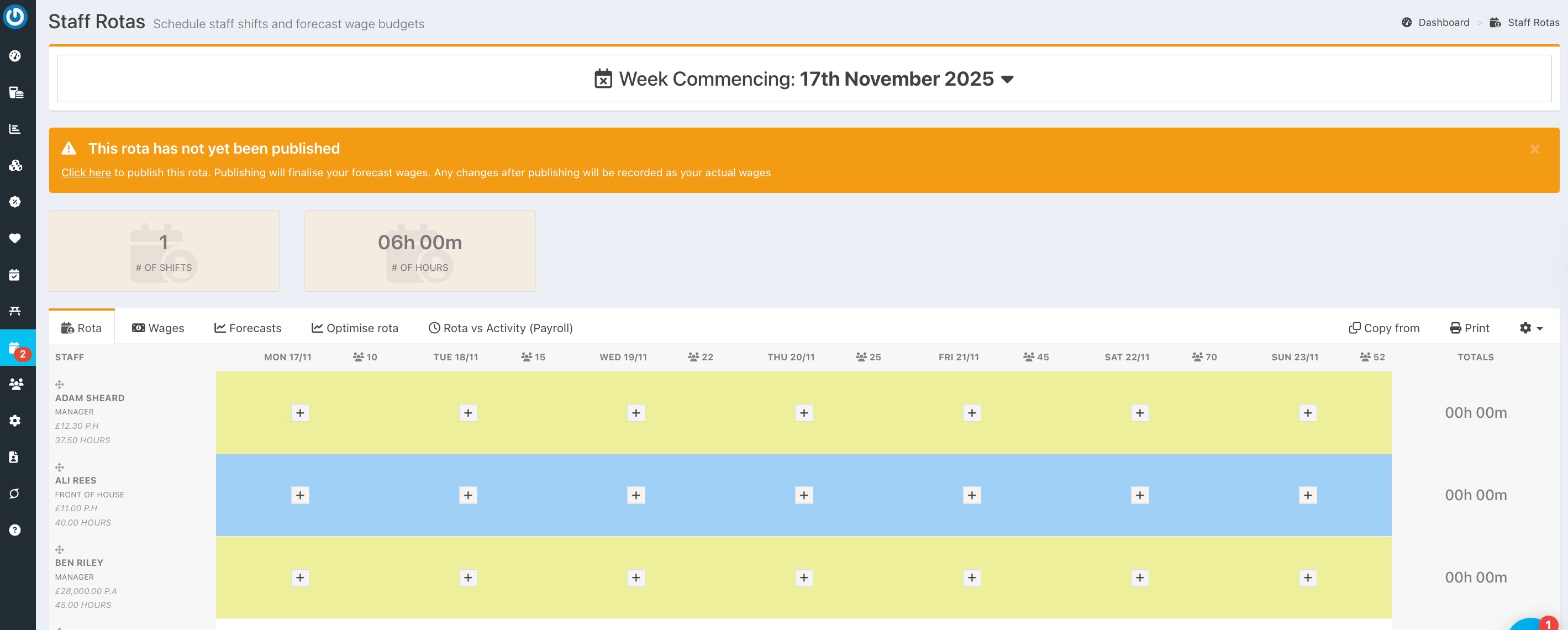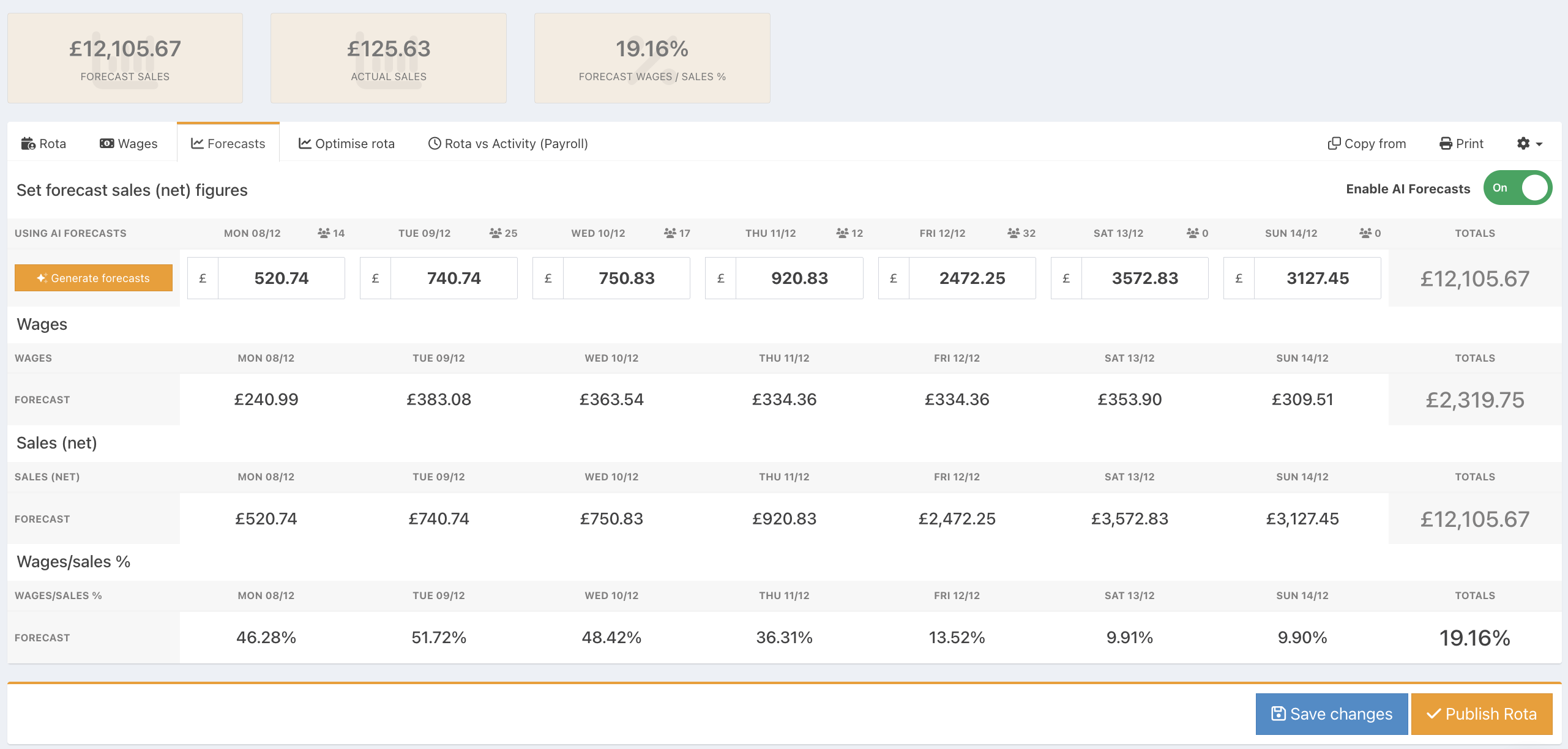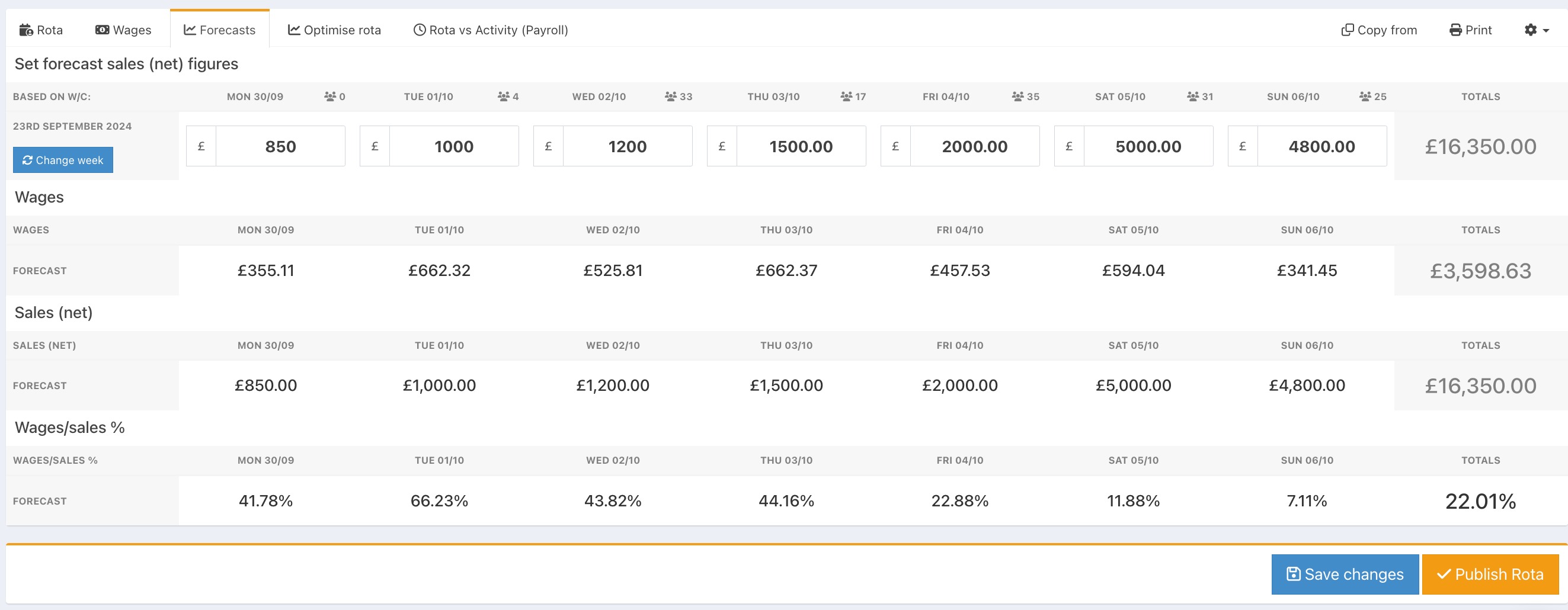 Publishing your rota will permanently save the figures as your forecast for the week.