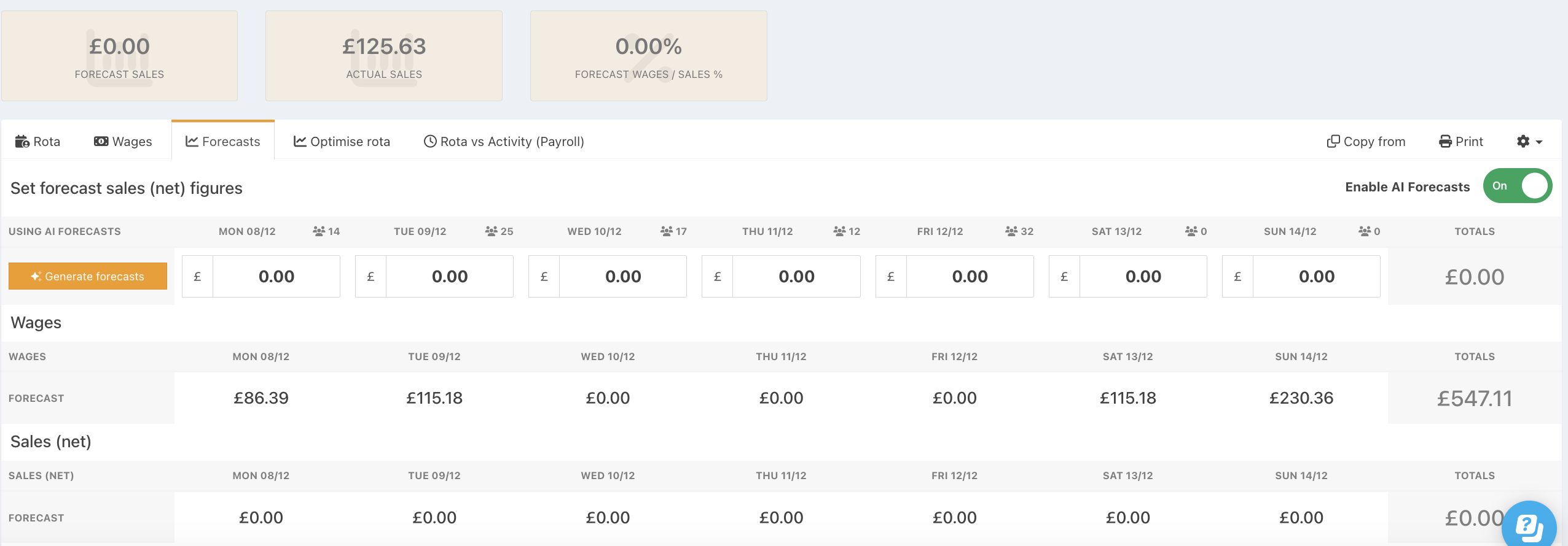 If you've already entered or uploaded your sales forecasts in the Forecasts module, these will pull through to the Forecasts tab of the rota automatically.