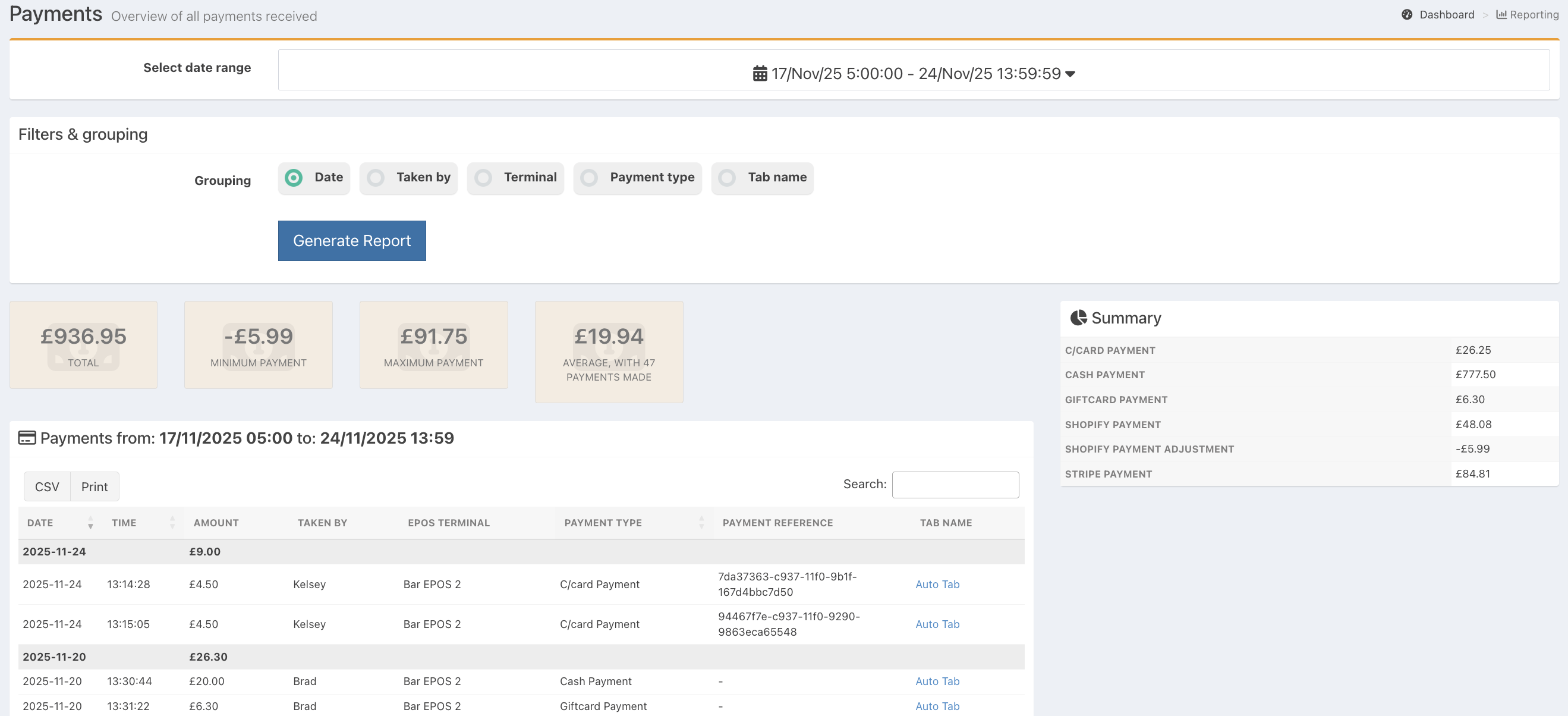 The payments report will give you a view of all payments put through your EPOS over any time period.