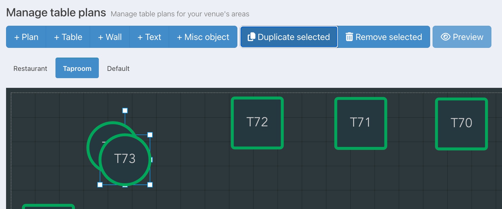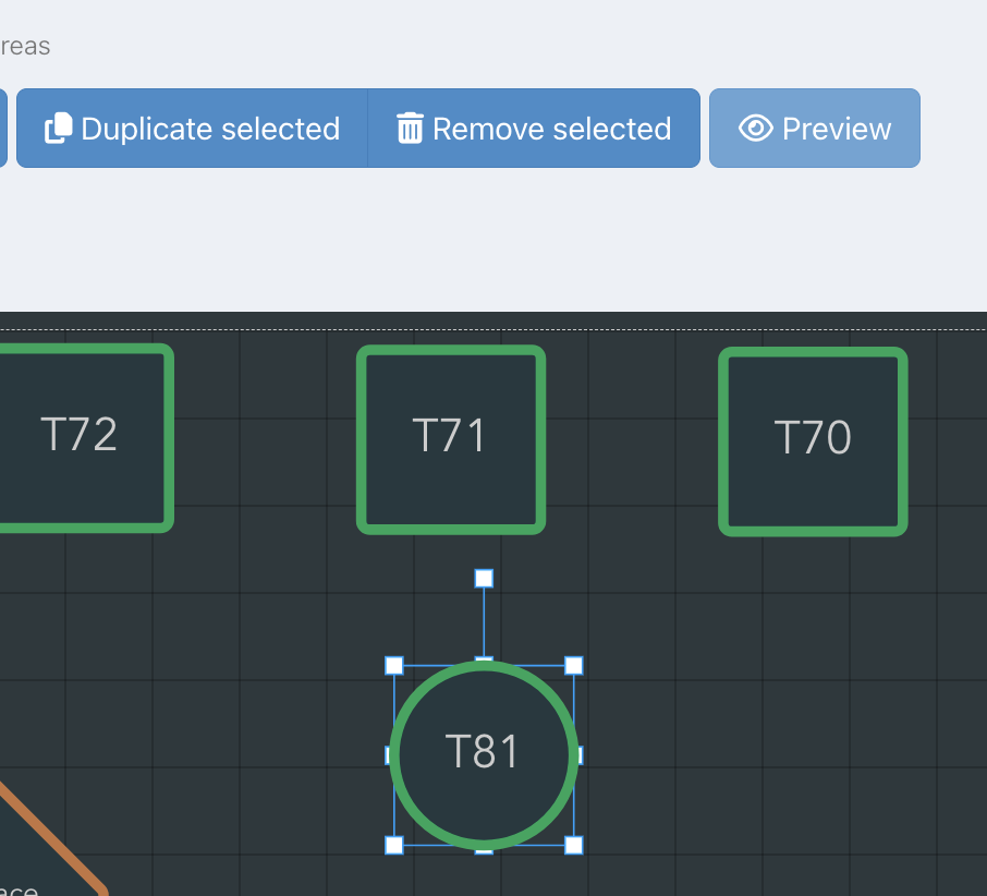 To keep your tables of a uniform size and colour, you can duplicate a table by clicking on the table and then clicking the Duplicate selected button at the top of the screen.