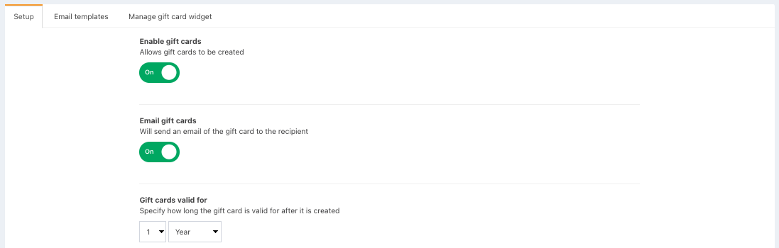 - Gift cards valid for - you can leave this as the default of 1 year, or change it here