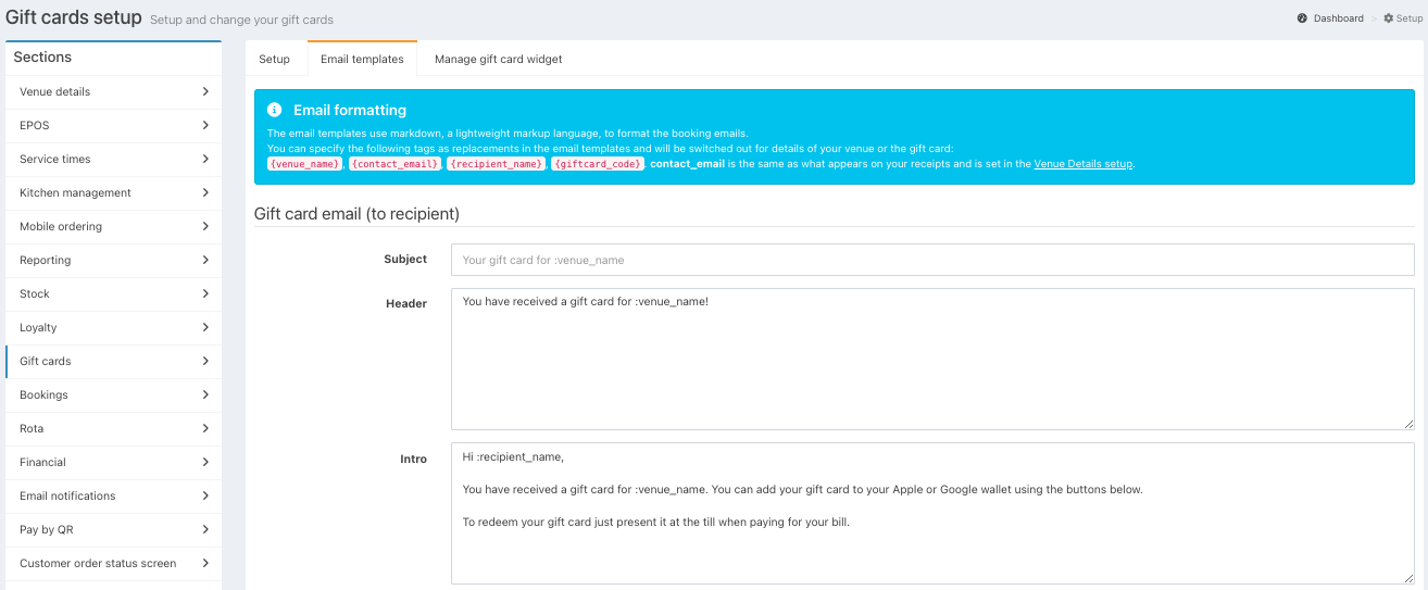 You can include tags in your email to insert data relating to your venue and the gift card: