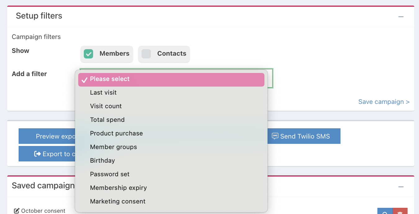 You can also send a bulk SMS message or export the results to Mailchimp for email marketing. If your segment is just members, you can add them to groups to assign promotions and send push notifications.