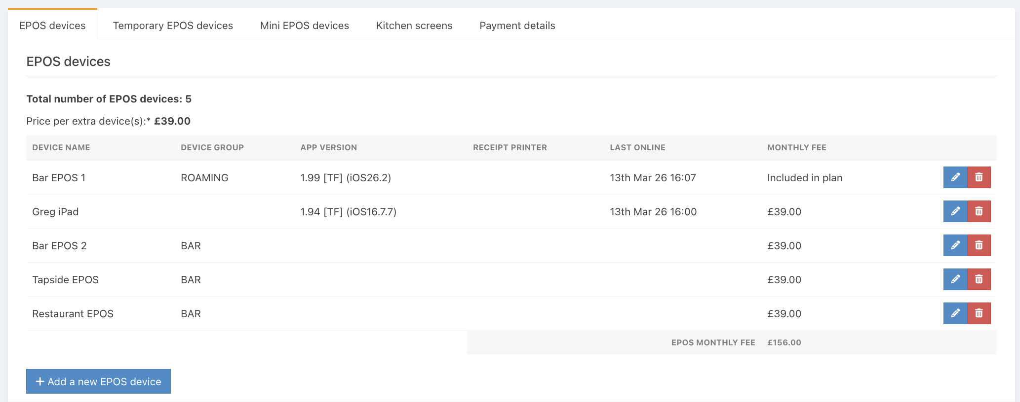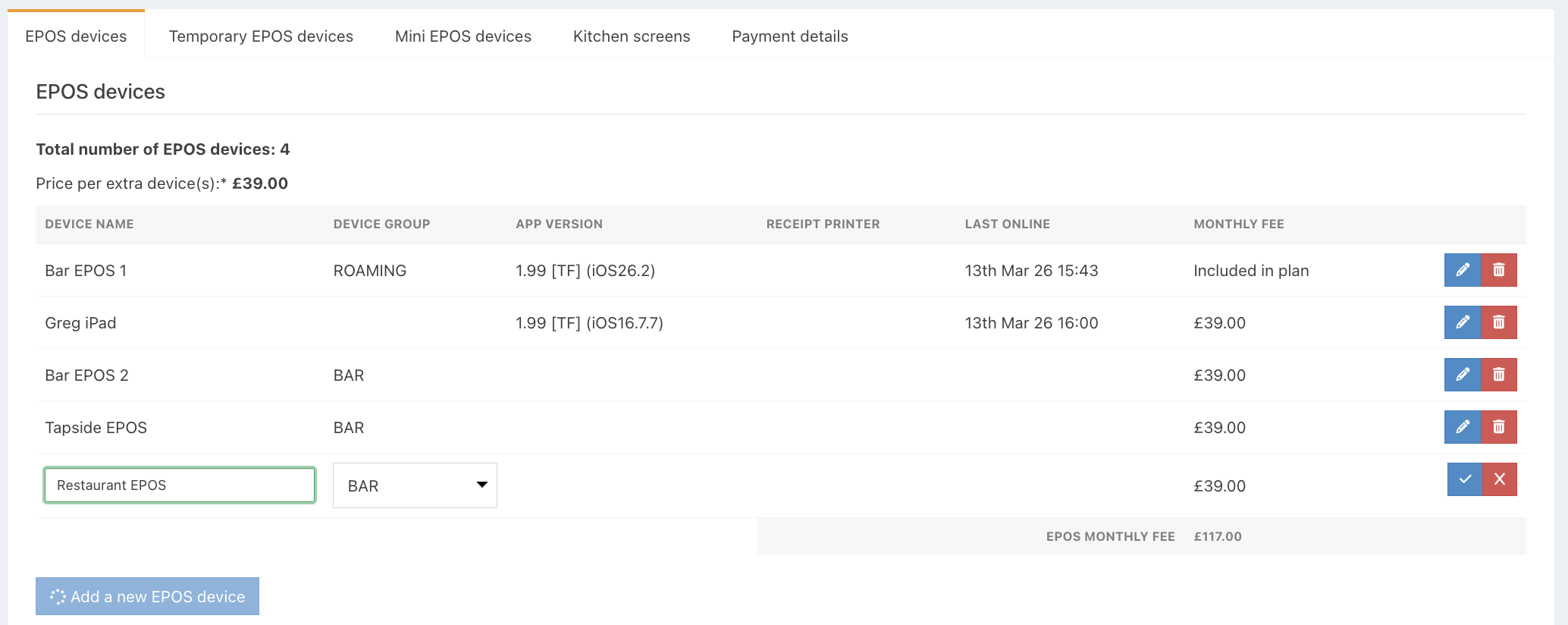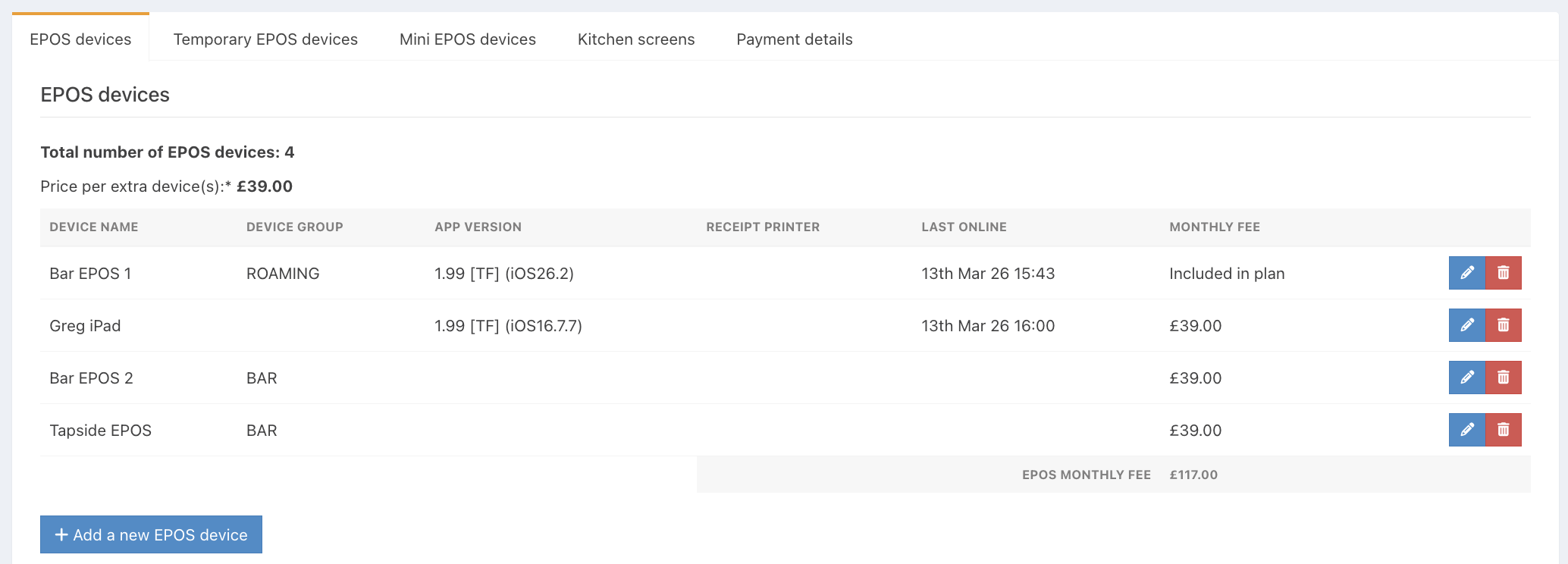 You can add additional EPOS devices, temporary EPOS devices, kitchen screens and Mini EPOS devices to your plan, as well as remove any devices you no longer need. This can be managed in the subscriptions module in the back office.