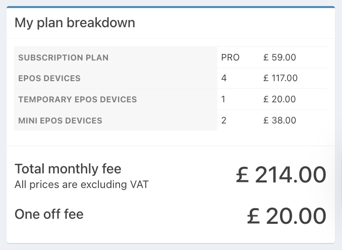 Note: A One off fee is for any Temporary EPOS devices that has been added to your plan.