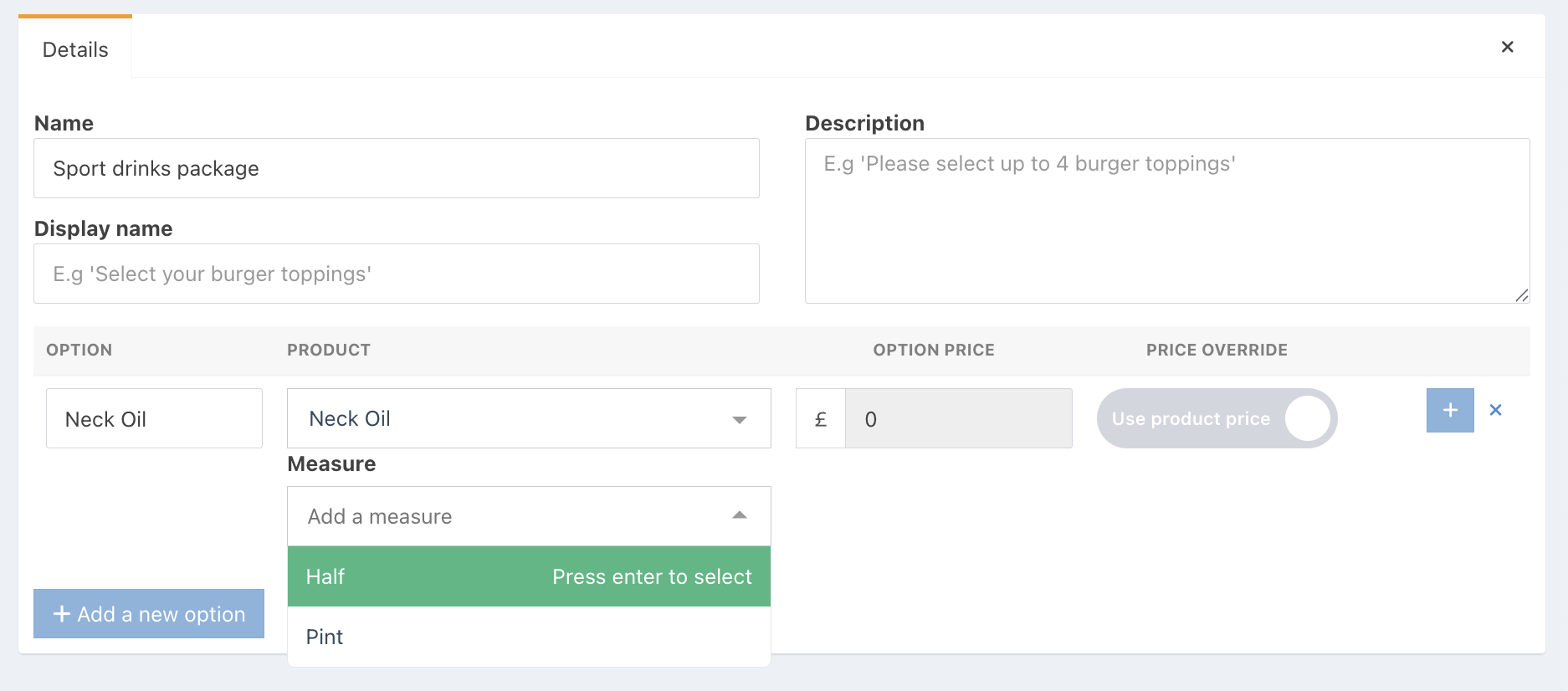 If the product you are adding to the option set has measure, a second dropdown will display for you to select which measure you would like to be included in the option set.