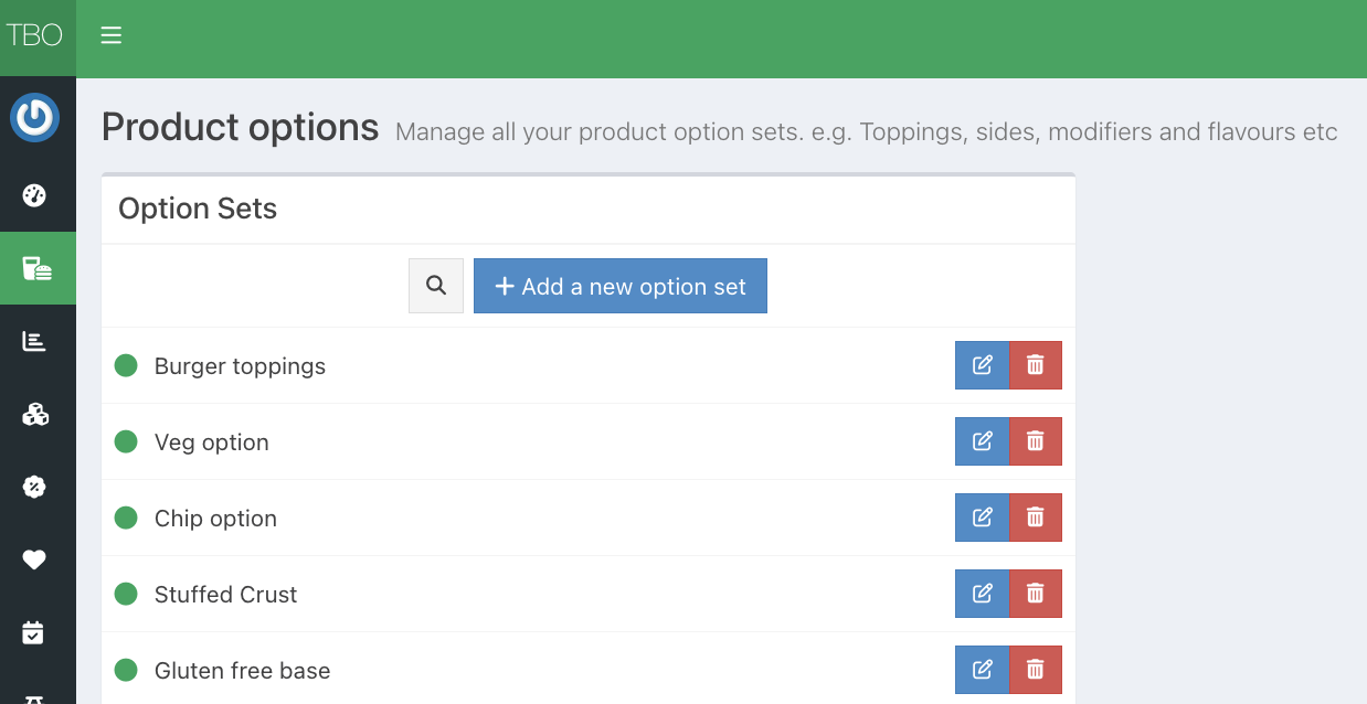 Option sets are also used to categorise items for meal deal promotions. For example a 2-course meal deal could link to a starters option set and a mains option set.