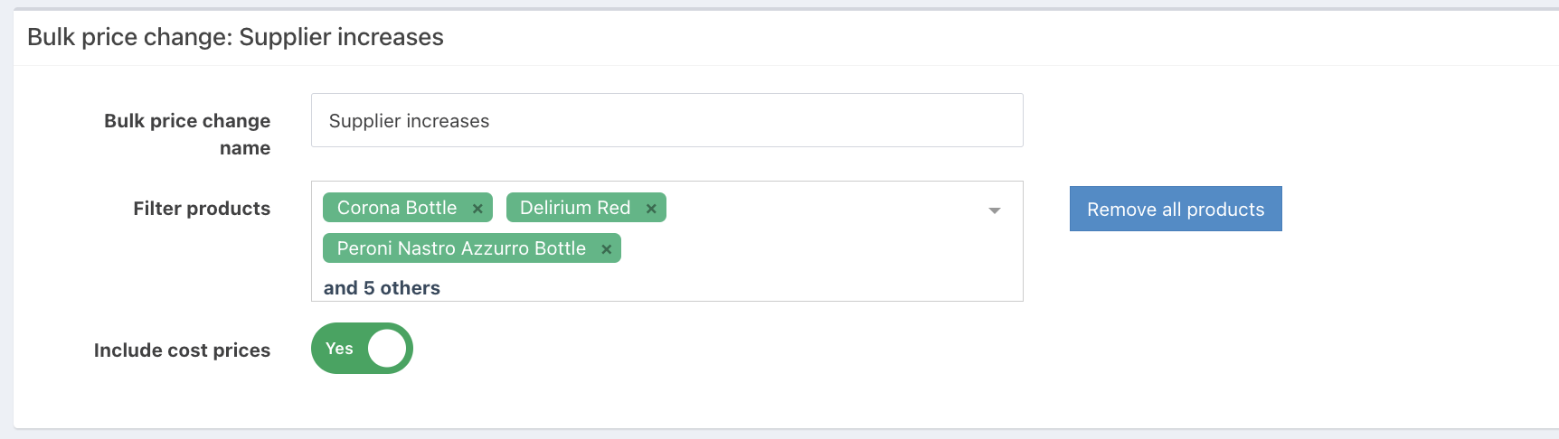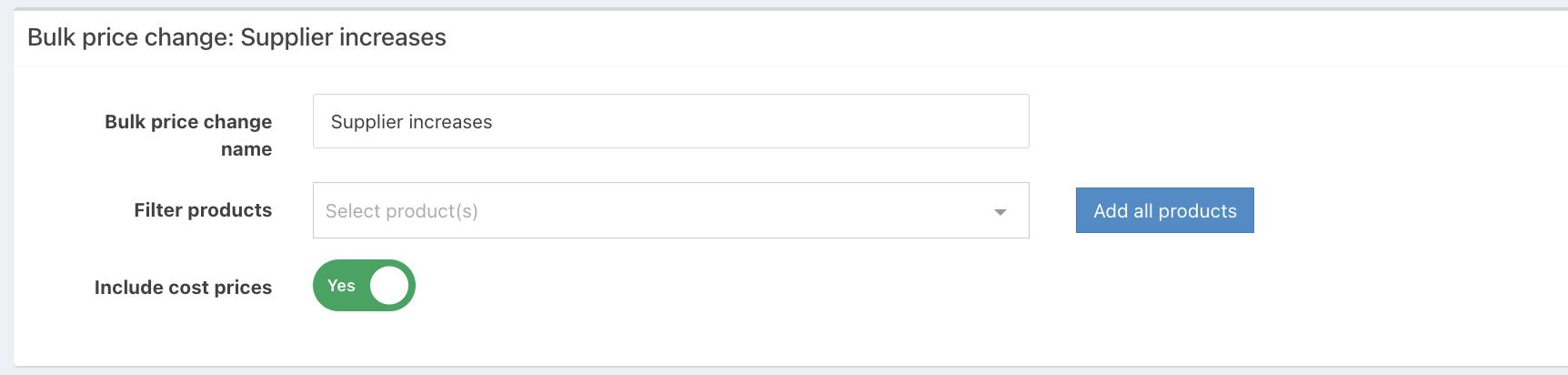 Bulk price changes can be useful for updating supplier cost prices and putting through general sales price increases that affect a lot of your products. With a bulk price change you can: