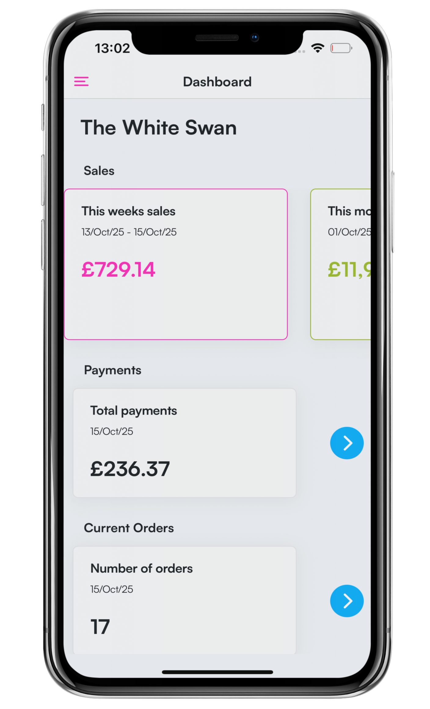 You can see all payments, orders and current tabs for the day by clicking the blue arrow to right of the corresponding totals box. Alternatively, you can navigate to the above areas through the pink Menu icon in the top left of the dashboard.