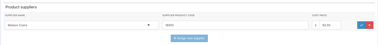 The supplier information fields will open. Using the Supplier name dropdown, choose the correct supplier. Optionally enter a Supplier product code and update the Cost price if required. Then click the blue tick button, at the end of the supplier row.