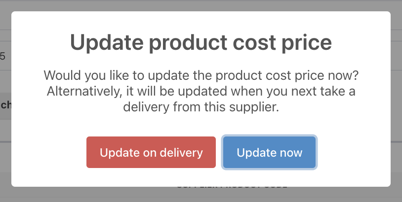 If you have updated the cost price, you will be asked to confirm whether you want to update the cost price for this product now, or when you next take a delivery from the supplier. Click the corresponding button.