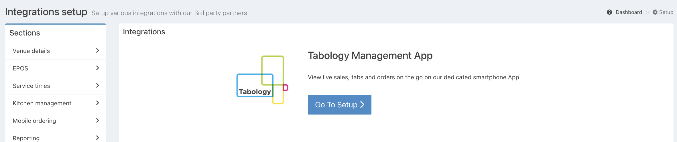 Click Go to setup, from the Tabology Management app integration.