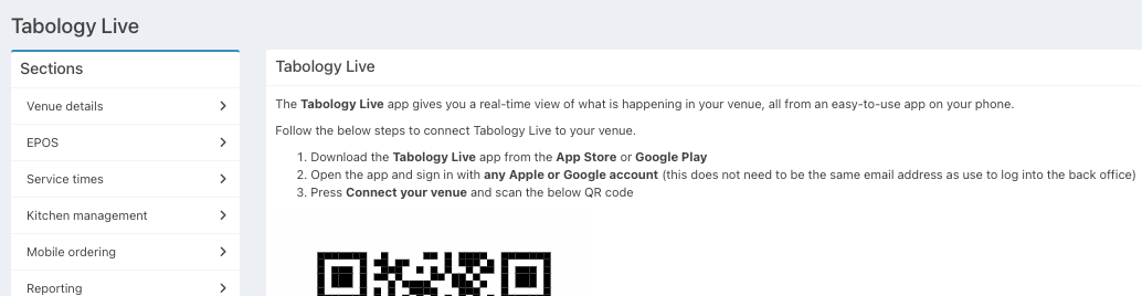 Follow the instructions from the Tabologe Live app setup and scan the Venue Connect QR code displayed.
