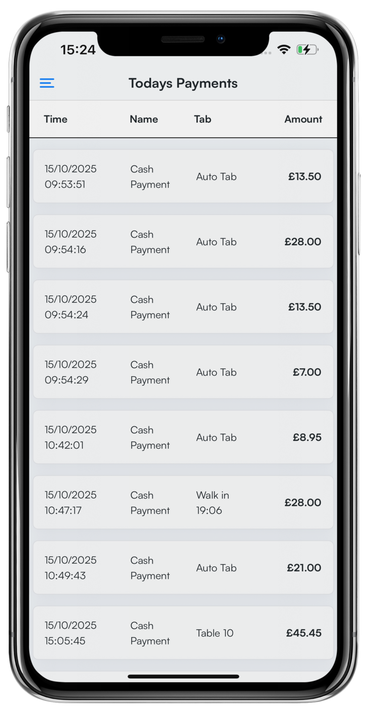 When in the Payment screen, the list of the current days payments will display. You will be able to see: