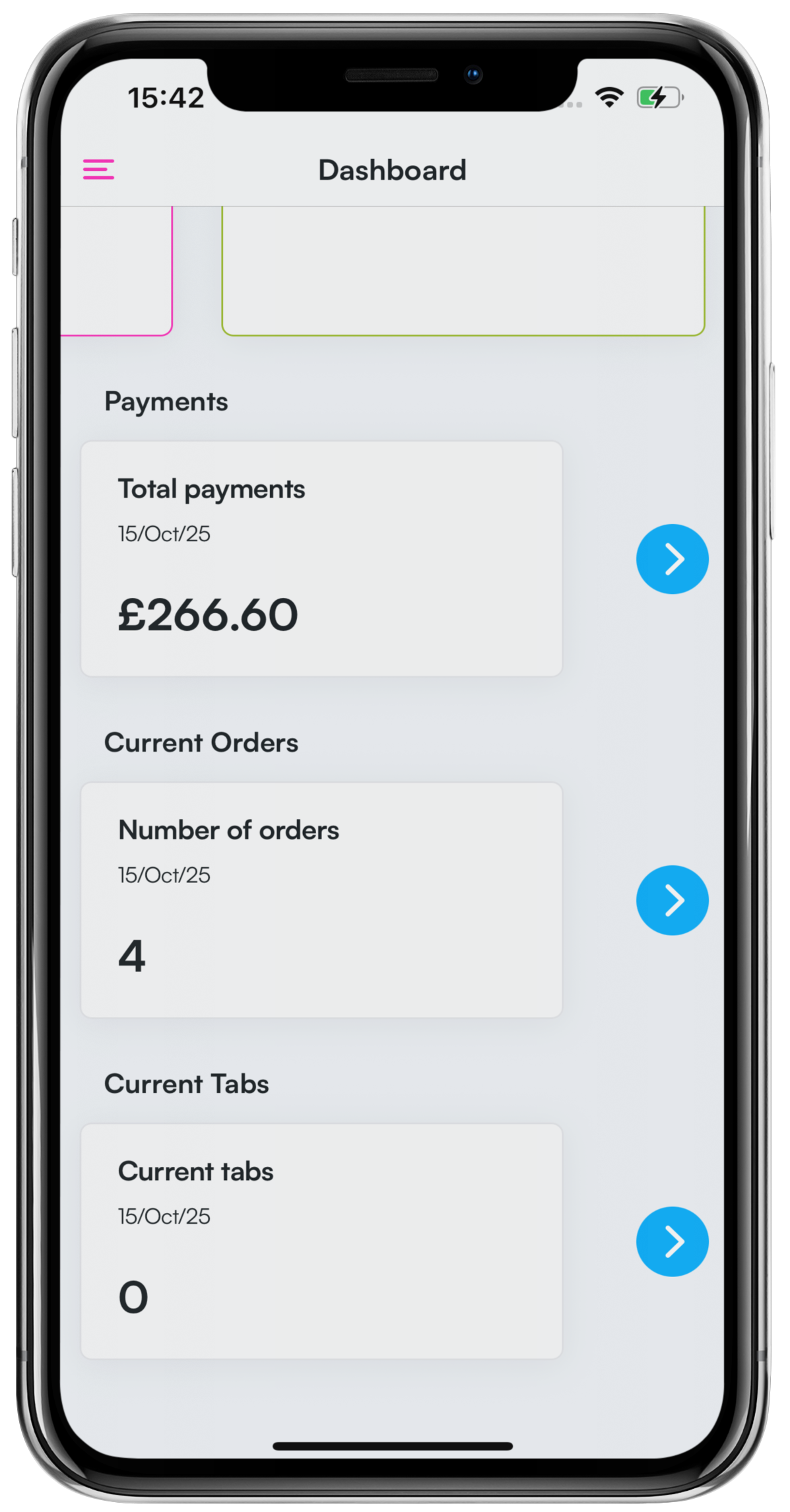 You can view current orders in the management app by clicking the blue Arrow next to the payments box, or by clicking the Menu icon from the top left of the dashboard.