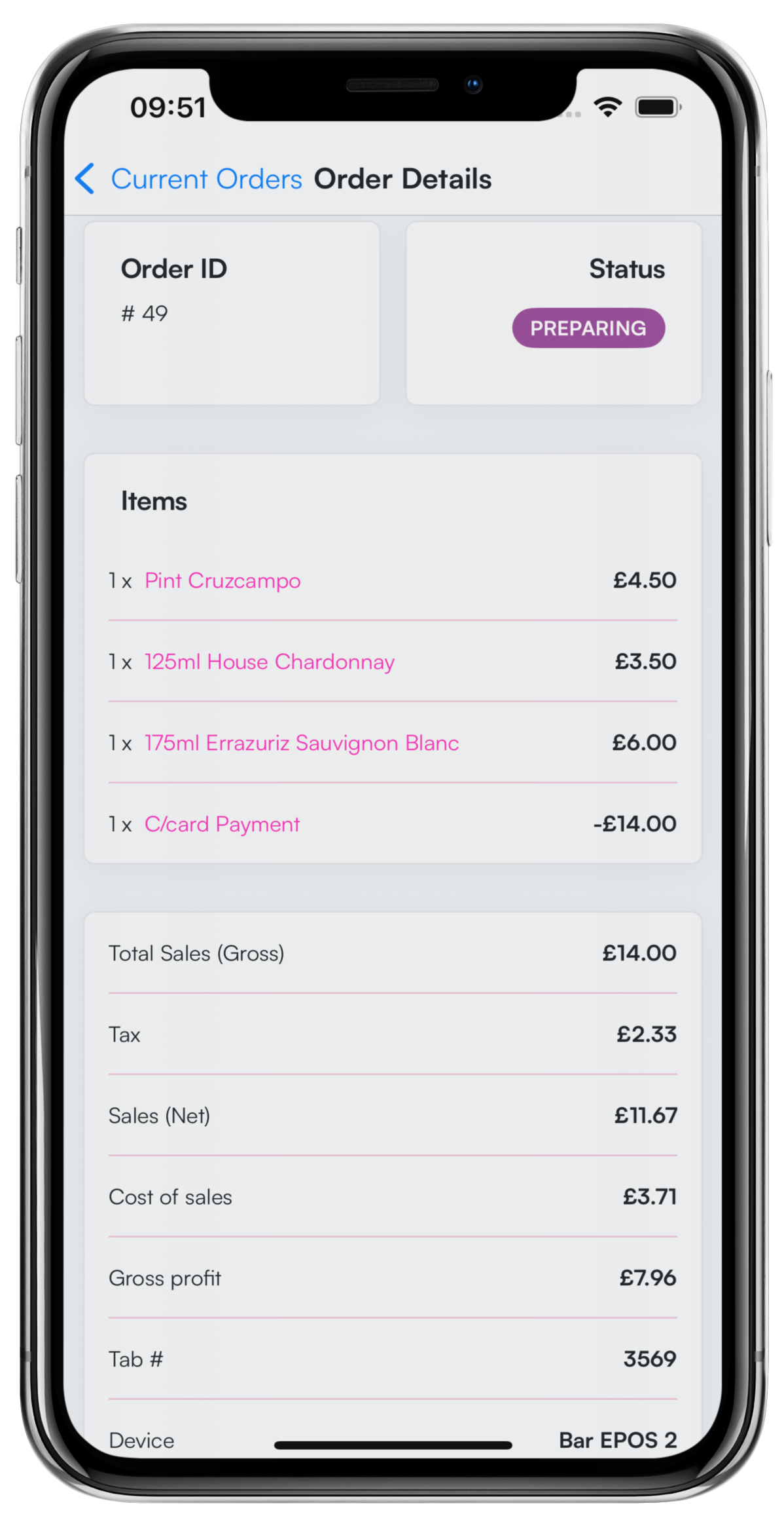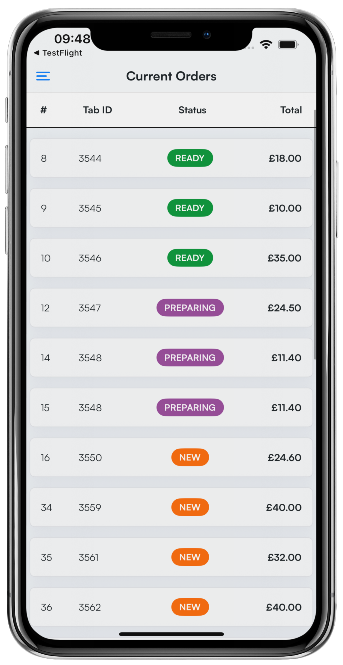 When in the Orders screen, the list of the current days orders will display. You will be able to see: