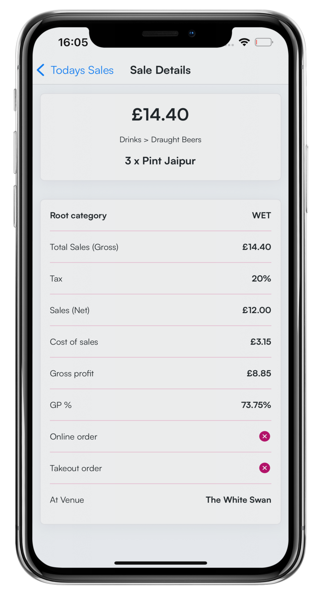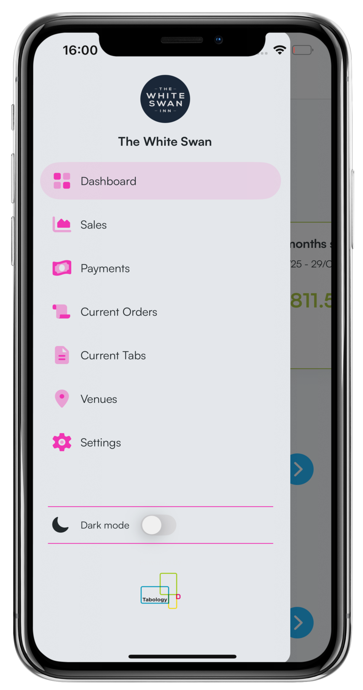 Sales for the current day can be viewed in the Management app by clicking the Menu icon from the top left of the dashboard, followed by Sales.