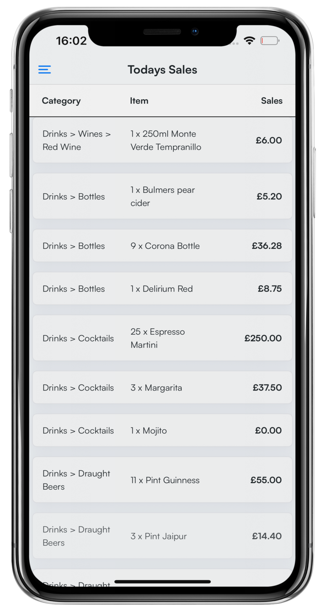 When in the Sales screen, you will see a list of items sold for the current days, grouped by item. You will be able to see: