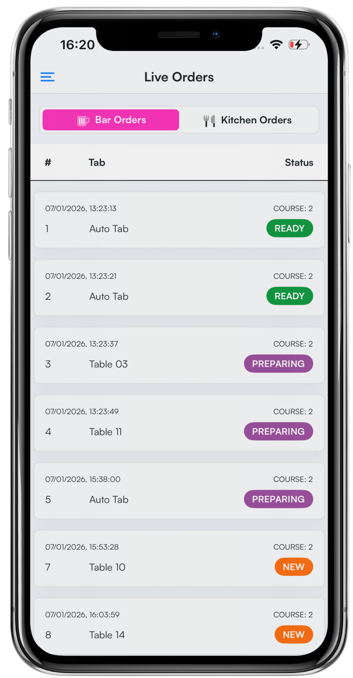 You will see a list of live Bar orders. You can select the Kitchen Orders tab at the top of the screen to see a list of Kitchen orders.