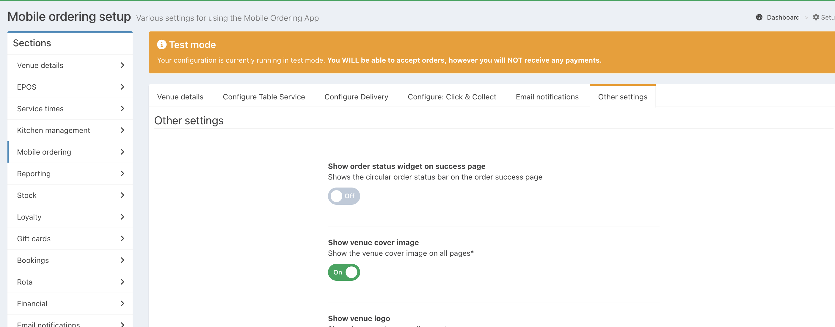 To hide the order status wheel, go to Setup > Mobile ordering > Other settings