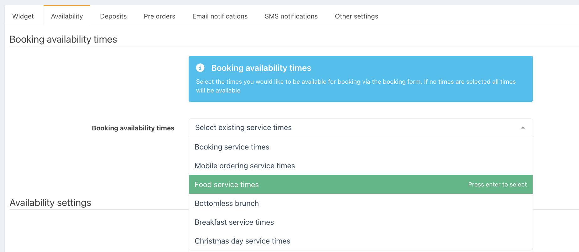 Click in the Booking availability times dropdown box & select the service time you would like to use for bookings.