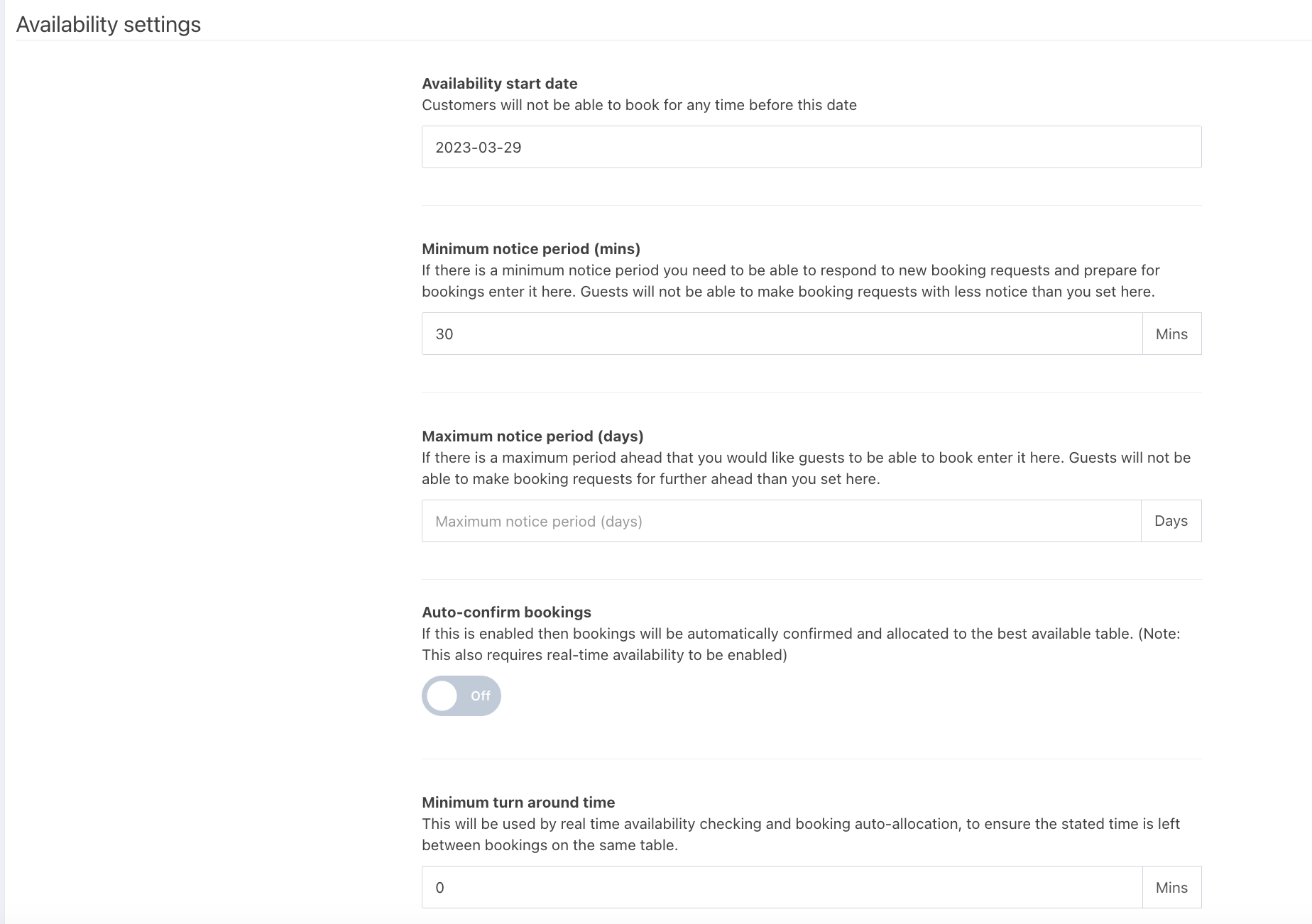 - Minimum turnaround time: If you need a set amount of time to turn a table over between bookings, you can set a minimum turnaround time