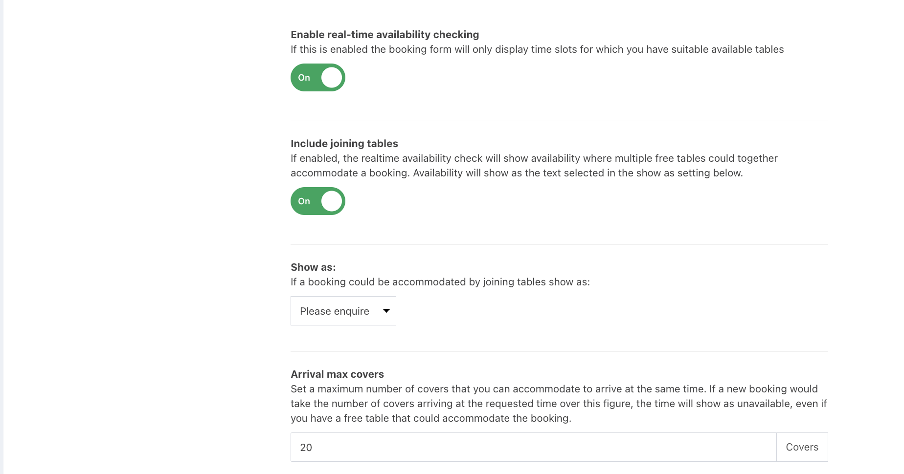 - Include joining tables - Enable this to allow the realtime availability checker to show availability when multiple free tables could be joined to accommodate a booking