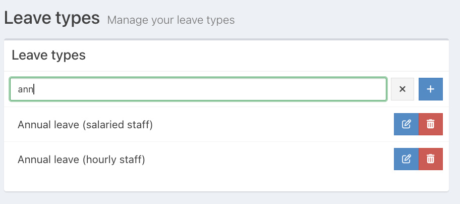 If you have a long list of Leave types, you can use the Search function at the top of the Leave type list to quickly locate a Leave Type.
