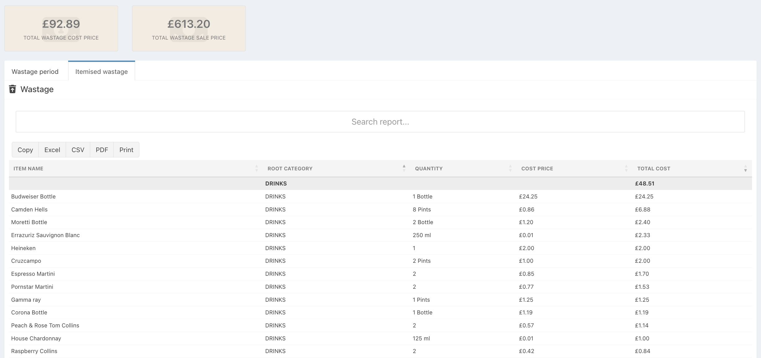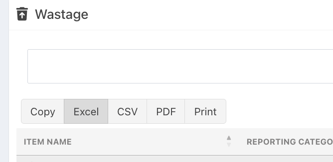 The wastage report can also be copied to your clipboard, exported to Excel or CSV, downloaded as a PDF or printed.