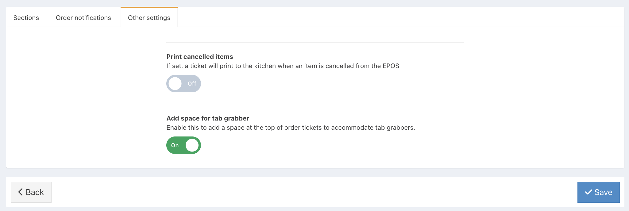 If the tab grabber you use to hold food order tickets covers up the table number, you can turn this setting on to add more white space to the top of your order tickets so the table number remains visible.